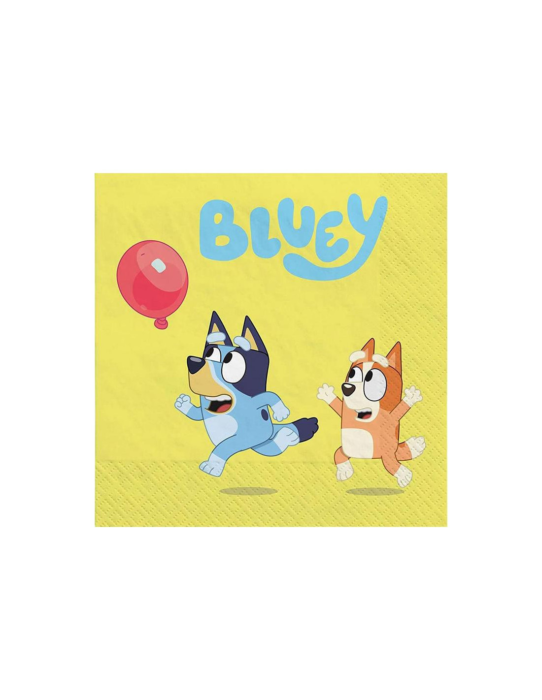 Graziosi tovaglioli con stampa di Bluey su sfondo giallo per festeggiare il compleanno di un fan del curioso e dinamico Bluey.
