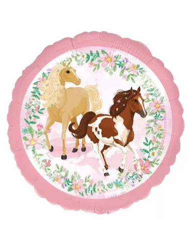 Questo palloncino rotondo in foil è la scelta ideale per aggiungere un tocco di magia alla tua festa. Il suo design elegante con due cavalli su uno sfondo rosa e floreale piacerà a grandi e piccini.