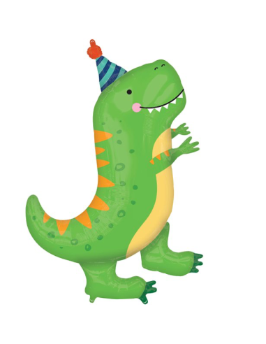 Questo palloncino verde a forma di dinosauro, decorato con un cappellino da festa, sarà la decorazione ideale per il compleanno a tema dinosauri del tuo bambino.