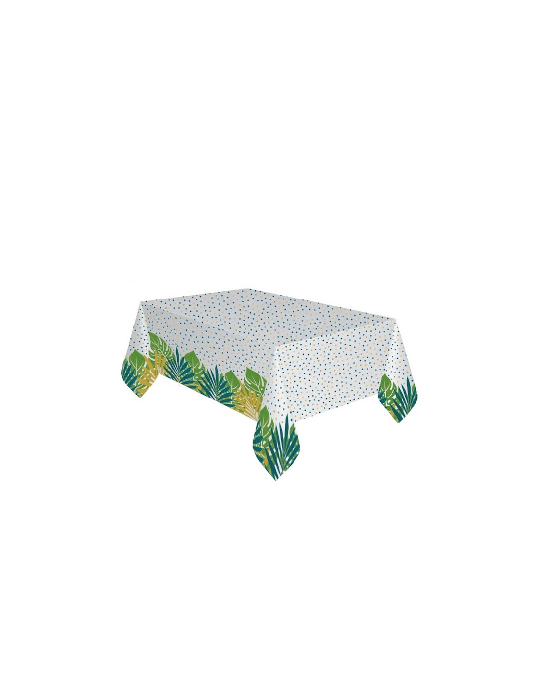 Questa graziosa tovaglia sarà perfetta per apparecchiare una tavola tropicale per un compleanno esotico, una festa hawaiana o una festa a tema tropicale, giungla, Aloha ... È bianca, decorata con foglie tropicali nelle tonalità del verde e dell'oro.