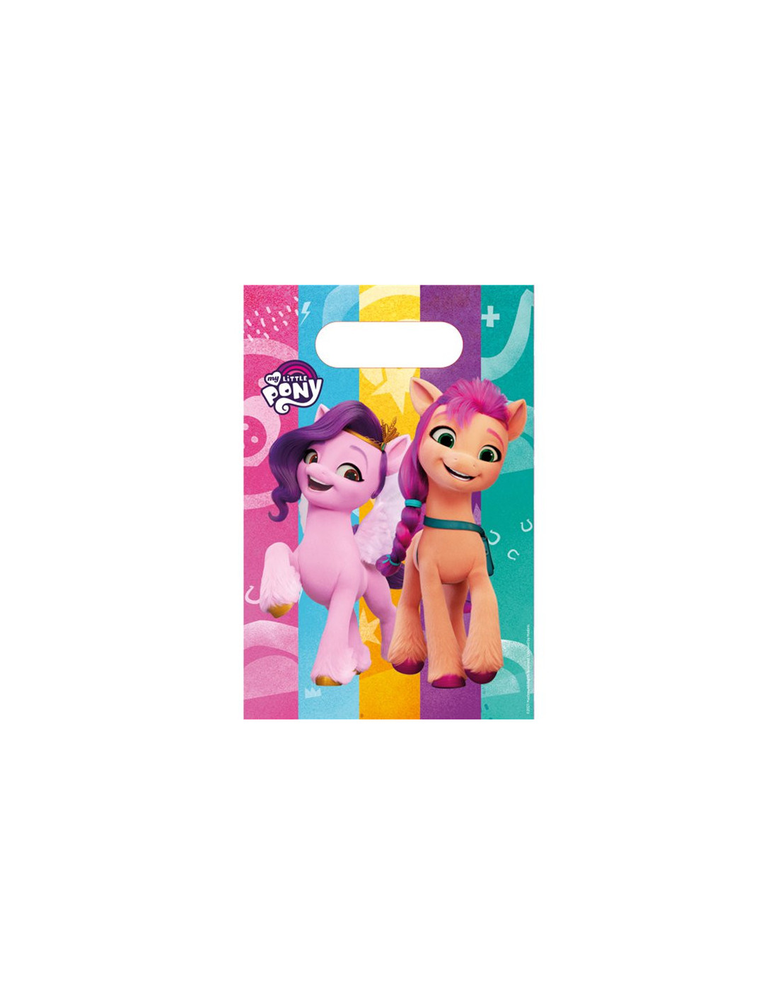 Questi eleganti sacchetti di carta per feste dai colori vivaci presentano Sunny Starscout e Pipp Petals sul davanti. Sul retro sono raffigurati Hitch Trailblazer, Izzy Moonbow e Zipp Storm. Sono perfetti come bomboniere per feste di compleanno a tema My Little Pony.