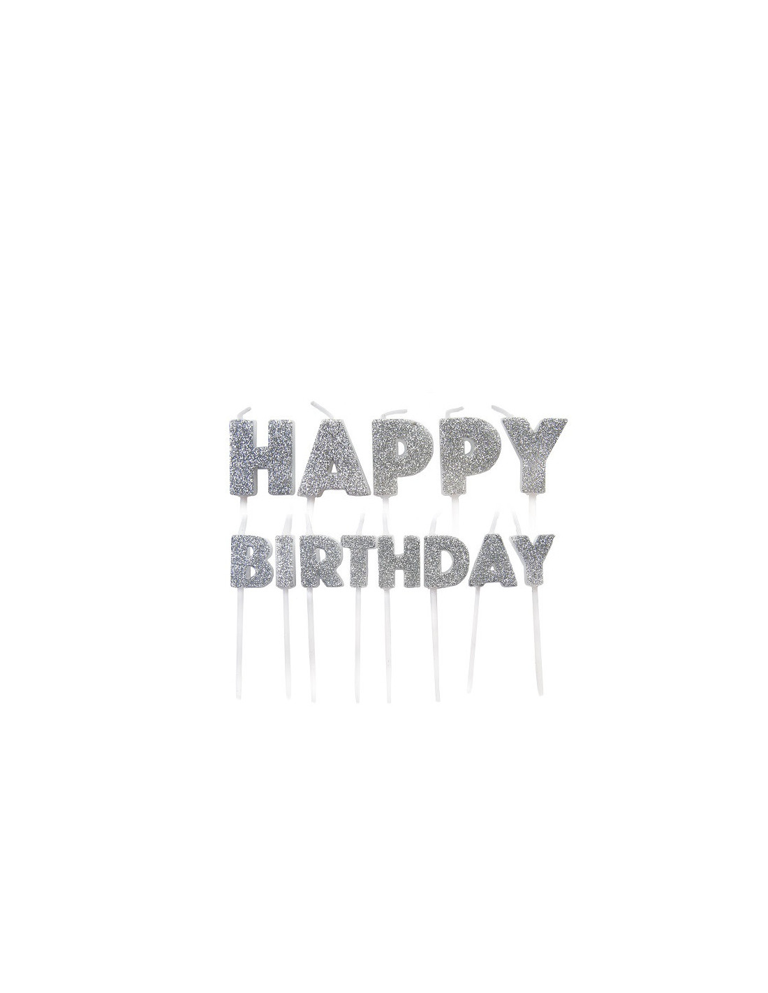 Candeline perfette per decorare la tua torta di compleanno! Questo set di 13 candeline "Happy Birthday" argentate e glitterate aggiungerà un tocco di eleganza alle decorazioni della tua tavola.