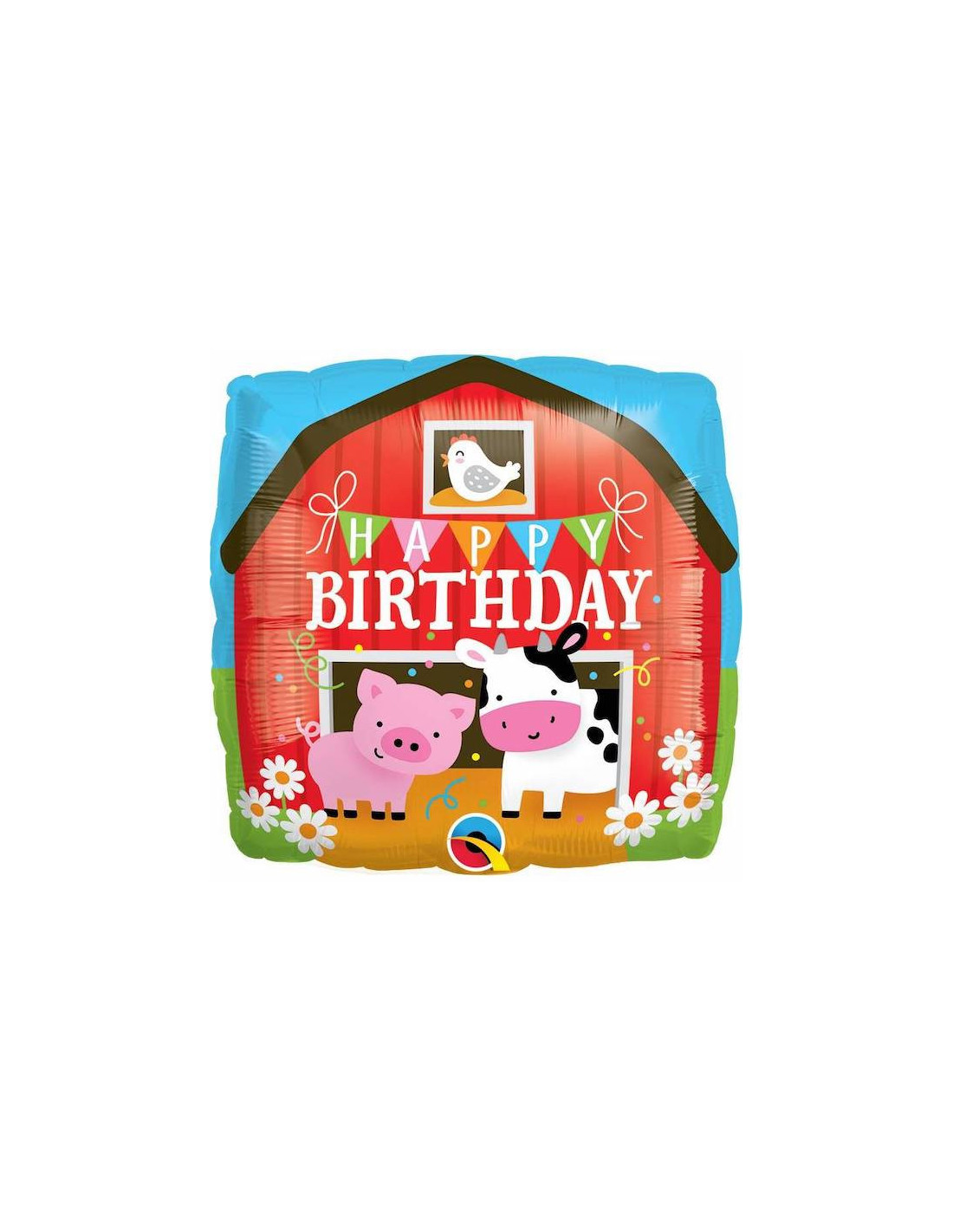 Un grazioso e colorato palloncino di alluminio con diversi animali della fattoria e la scritta "Buon compleanno".