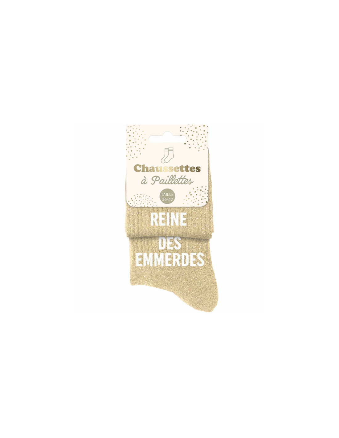Aggiungi un tocco di brillantezza e personalità con questi calzini Duo con paillettes beige e oro "QUEEN & TROUBLE". Il loro design scintillante e il messaggio audace li rendono l'accessorio perfetto per completare un outfit unico o per un regalo spiritoso.