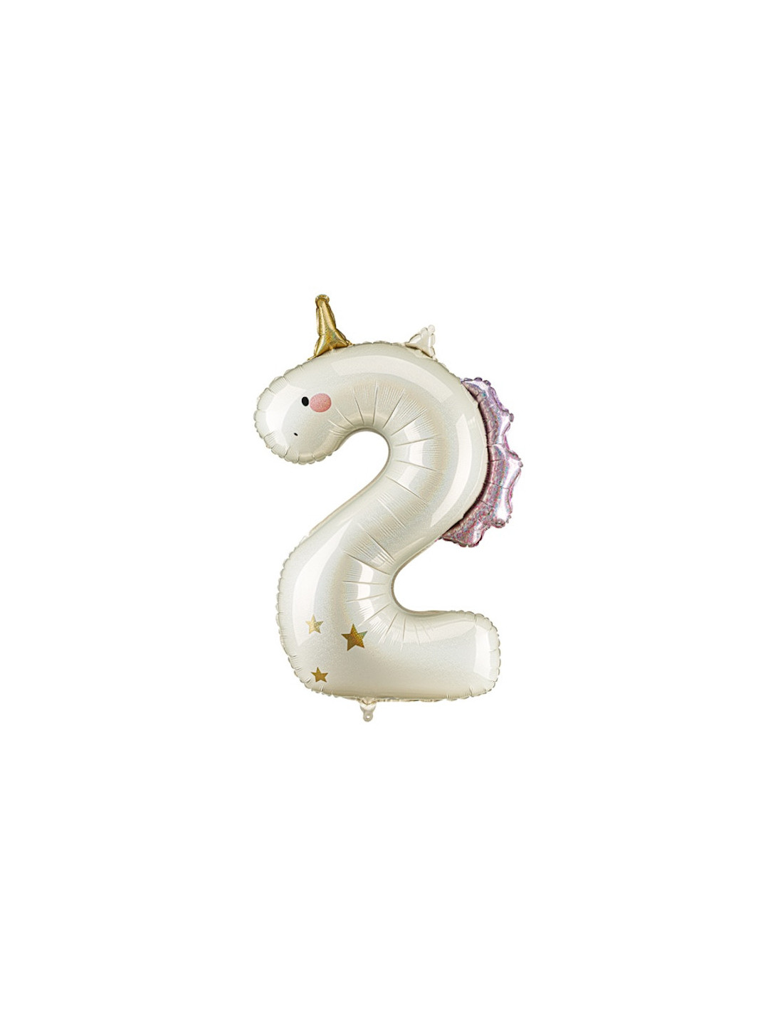Palloncino in foil Unicorno numero 2, color crema con effetto olografico, decorato con dettagli rosa chiaro e oro, 118 cm